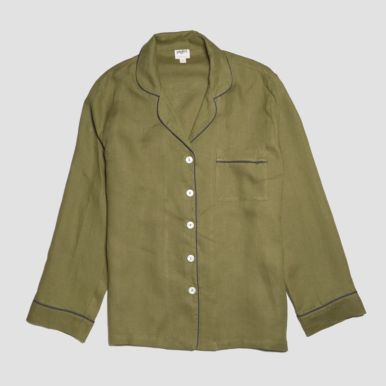 Made for those who like their sleepwear to be timeless yet comfortable, our green Moss Linen Pajama Shirt is made from super soft 100% stonewashed linen and is embellished with navy piping around the cuffs, collar and breast pocket. Linen keeps you cozy and warm in the winter and cool in the summer. Our linen pajama shirt can be paired with our pajama trousers to complete the look.