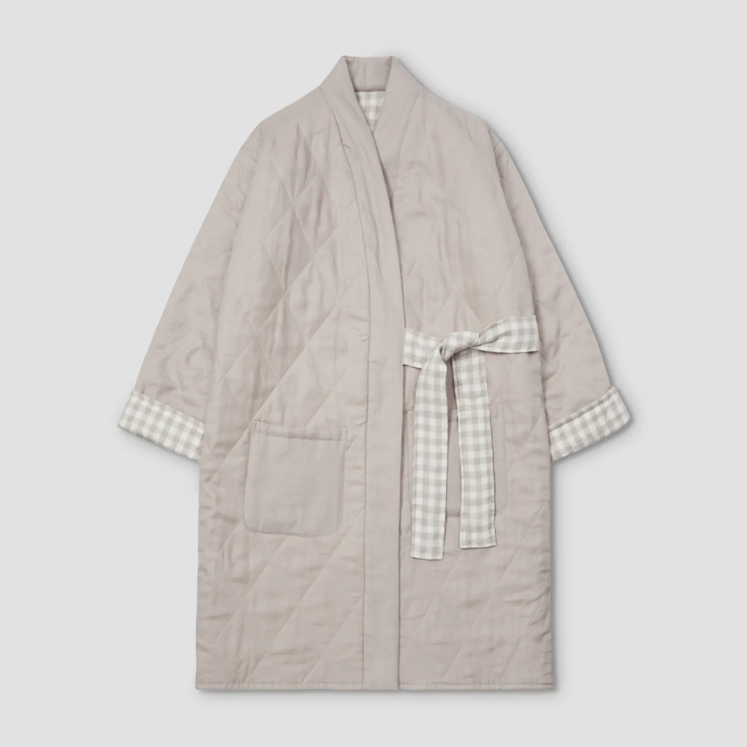 Our Mushroom Gingham Linen Housecoat is here to keep you cozy and warm, whether you’re making coffee on a chilly morning or snuggling up for the evening on the sofa. With its oversized style, reversible quilted design and handy pockets, this housecoat is sure to be your new loungewear staple.