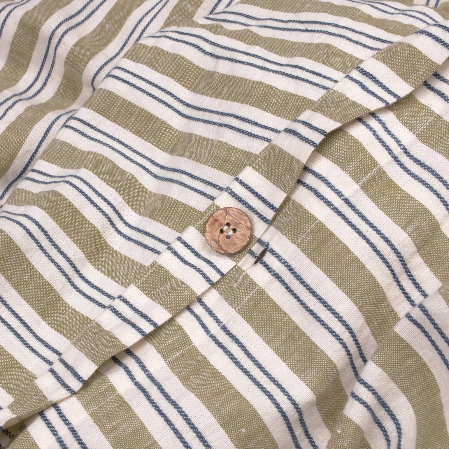 Our heritage-inspired Thyme Somerley stripe duvet cover features a classic warm green stripe interspersed with a patterned dobby weave for extra dimension. Made from a blend of European linen and cotton, this wonderfully breathable, comfortable and durable fabric offers the best of both worlds. This duvet cover features coconut shell button fastenings and handy inside corner ties to stop your duvet from slipping.