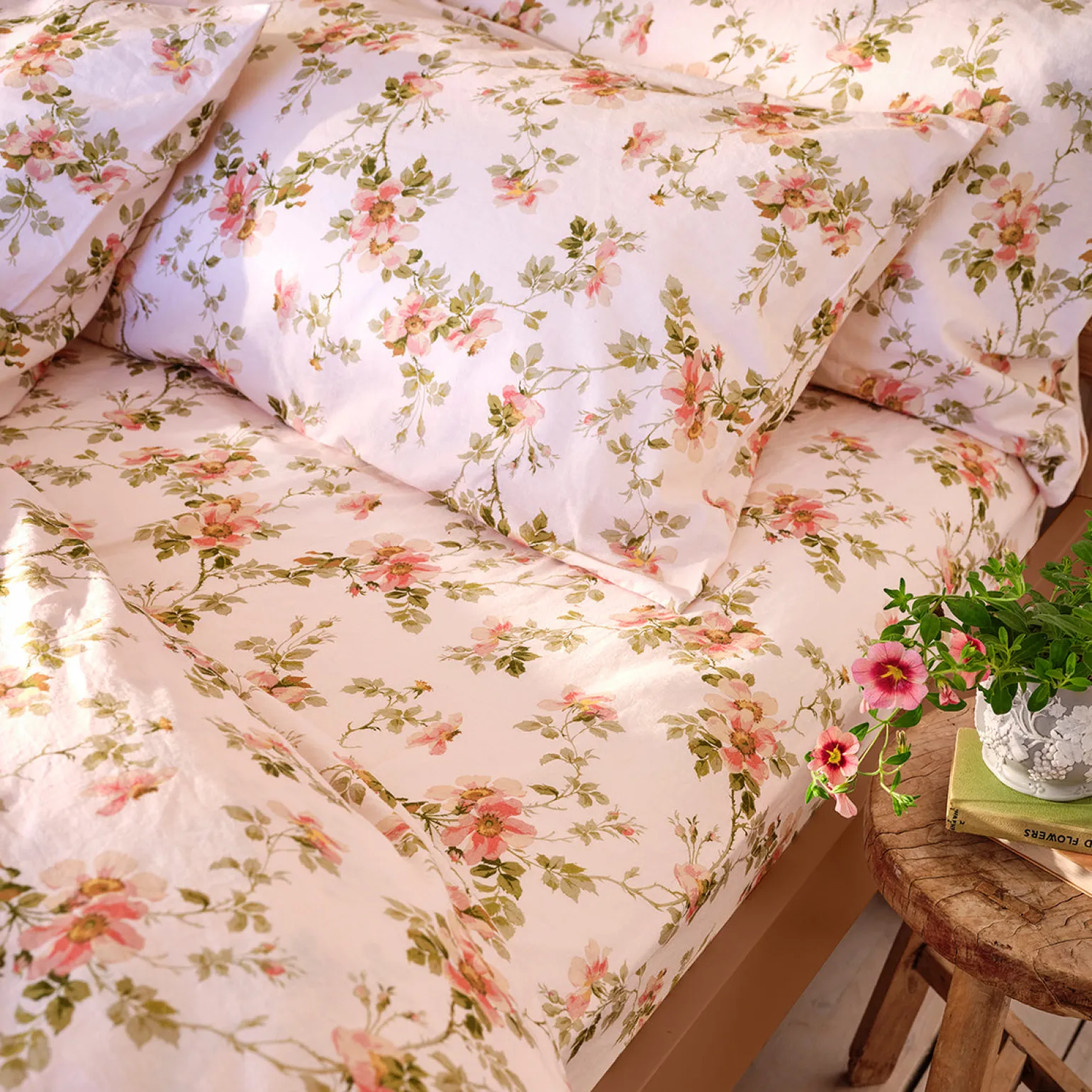 Our Cream Pastel Field Rose linen blend fitted sheet features a delicate printed floral motif of its namesake, inspired by a vintage pattern sourced from the Susanna Samson Design archives. Made from a blend of European linen and cotton, this wonderfully breathable, comfortable and durable fabric offers the best of both worlds. Our fitted sheets have elasticated edges all the way around and fit mattresses up to 16 inches deep.