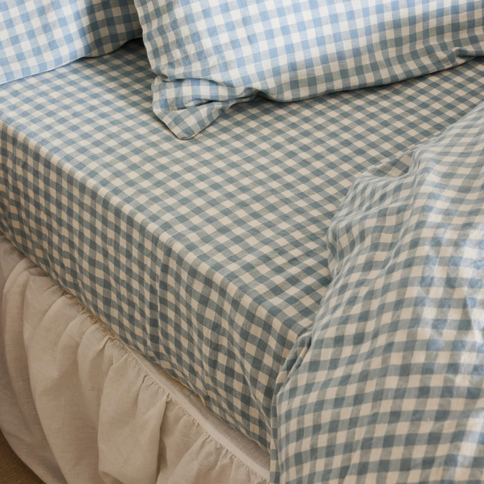 Timeless yet on-trend, our playful Warm Blue Gingham linen blend fitted sheet is the ultimate choice for modern cottagecore style. Made from only the highest-quality fibers, the breathable fabric combines the effortless look of linen with the softness of cotton. Our fitted sheets have elasticated edges all the way around and fit mattresses up to 16 inches deep.